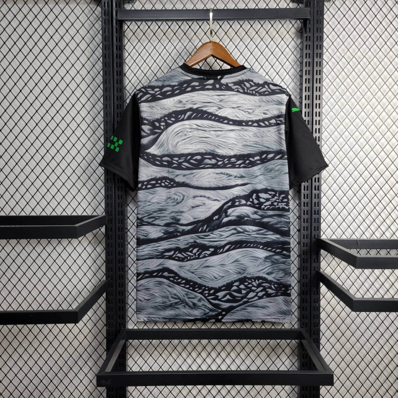 Unikalna koszulka Manchester City 2025 z dynamicznym, falującym wzorem w odcieniach szarości. Zielone detale i herb klubu kontrastują z czarnym tłem, tworząc nowoczesny, sportowy look. Wykonana z oddychającego materiału zapewniającego komfort w każdej sytuacji.