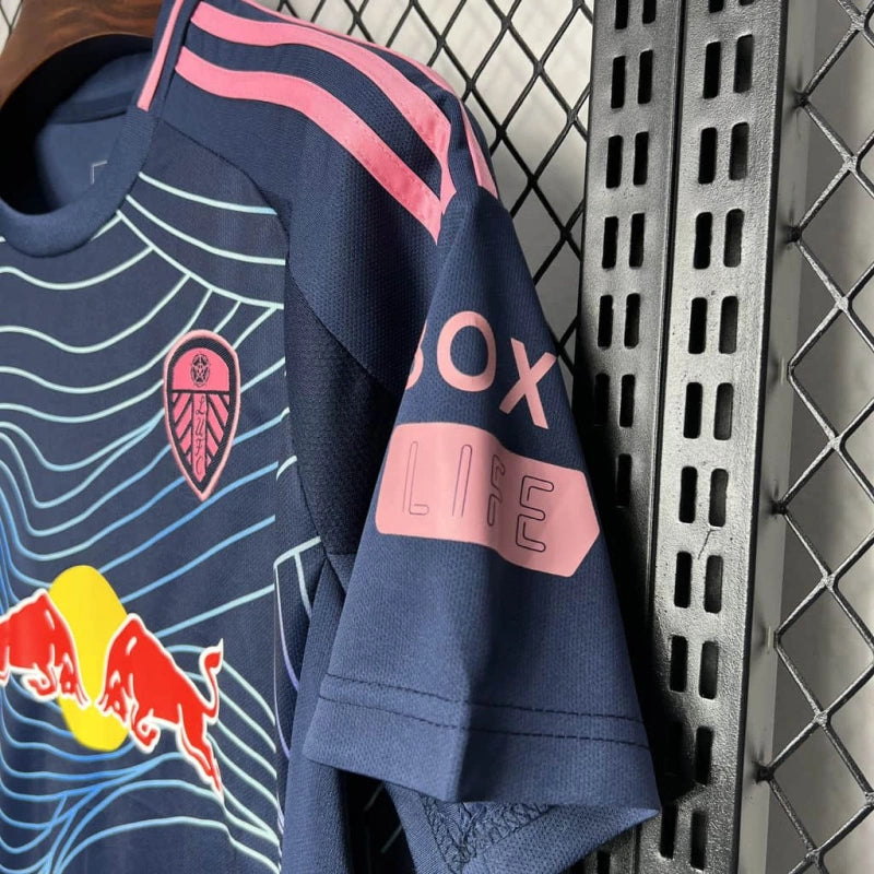 Koszulka wyjazdowa Leeds United 2024 zachwyca futurystycznym stylem i unikalnym motywem fal, inspirowanym energią i pasją klubu. Ciemnoniebieska baza z różowymi detalami oraz logo Red Bull nadają jej świeży, dynamiczny wygląd.