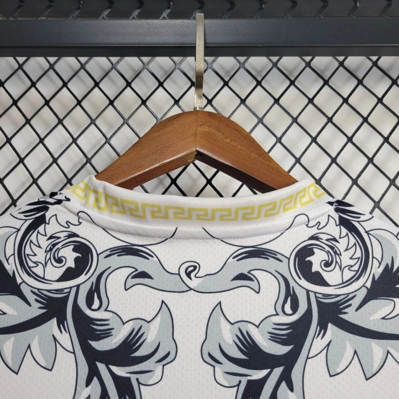 Luxusní dres italské reprezentace, vytvořený ve spolupráci s módním domem Versace. Bílá základna s bohatými zlatými a černými ozdobami vytváří jedinečný, elegantní vzhled. Ideální pro fanoušky, kteří ocení styl a prestiž v jednom.