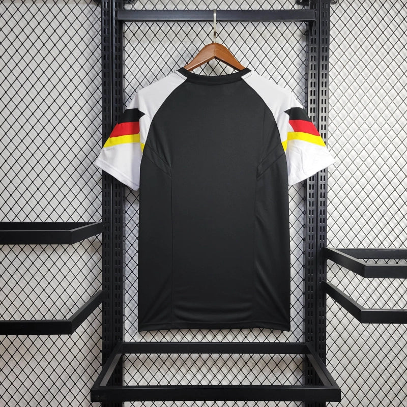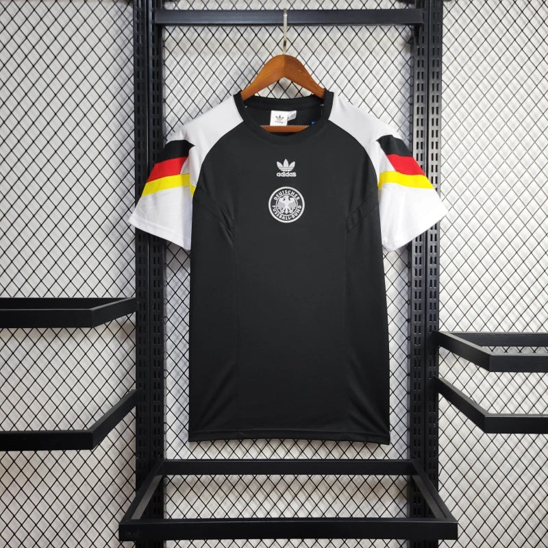 Černé tréninkové tričko německé reprezentace pro rok 2024 má minimalistický design s odvážným akcentem v podobě tříbarevných pruhů v barvách národní vlajky. Retro logo Adidas Originals mu dodává oldschoolový charakter.