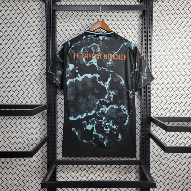 Třetí dres Bayernu Mnichov pro sezónu 2024 je kombinací černé barvy s efektním mramorovým vzorem v odstínech modré. Měděné akcenty dodávají eleganci a moderní design adidas dokonale vystihuje ducha bavorského giganta. Ideální pro fanoušky, kteří ocení výjimečný styl a kvalitu.