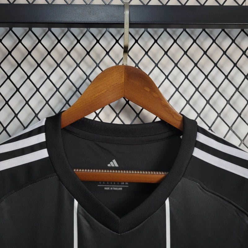Eintracht Frankfurtin neljäs pelipaita kaudelle 2025. Musta, valkoisilla pystysuorilla raidoilla ja punaisella seuran logolla. Klassinen Adidas-malli modernilla vivahteella.