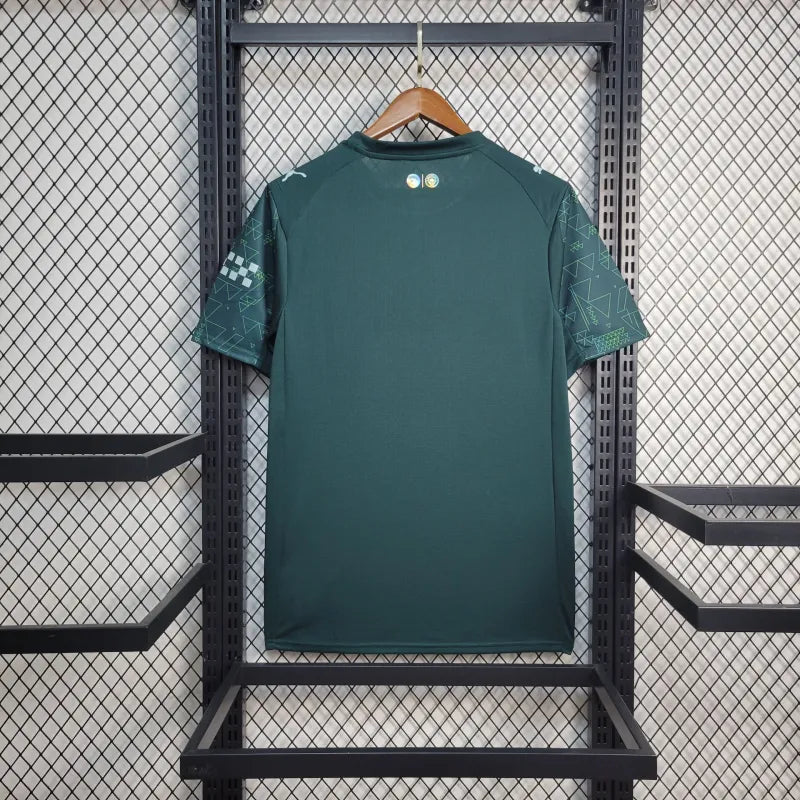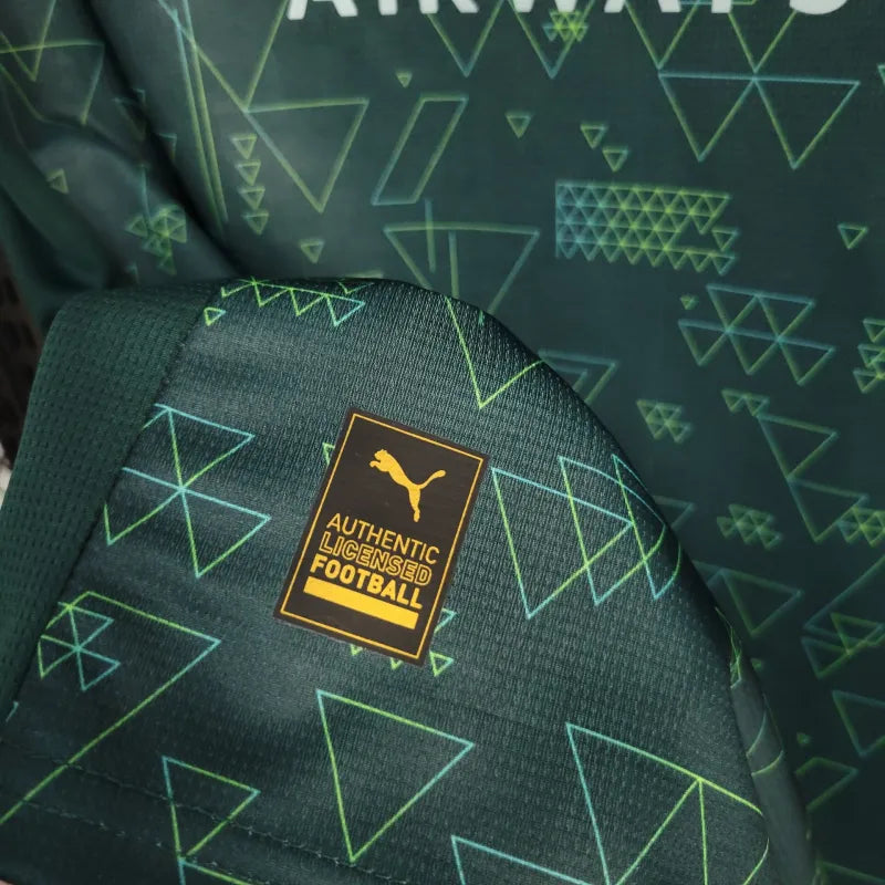 Koszulka czwarta Manchester City 2025 to świeże spojrzenie na design sportowy — ciemnozielona baza z geometrycznym, neonowym wzorem oddaje energię i kreatywność zespołu. Puma postawiła na unikalny motyw, który przyciąga wzrok i symbolizuje nowoczesność klubu.