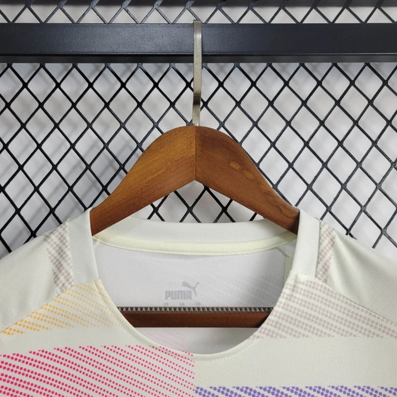 Wyjazdowa koszulka Venezii na sezon 2024 to artystyczne arcydzieło. Utrzymana w kremowym kolorze z pastelowymi, geometrycznymi pasami, łączy włoski styl z luksusową estetyką. Projekt Puma i minimalistyczne złote logo dodają jej wyjątkowej klasy. To jedna z najpiękniejszych koszulek sezonu.
