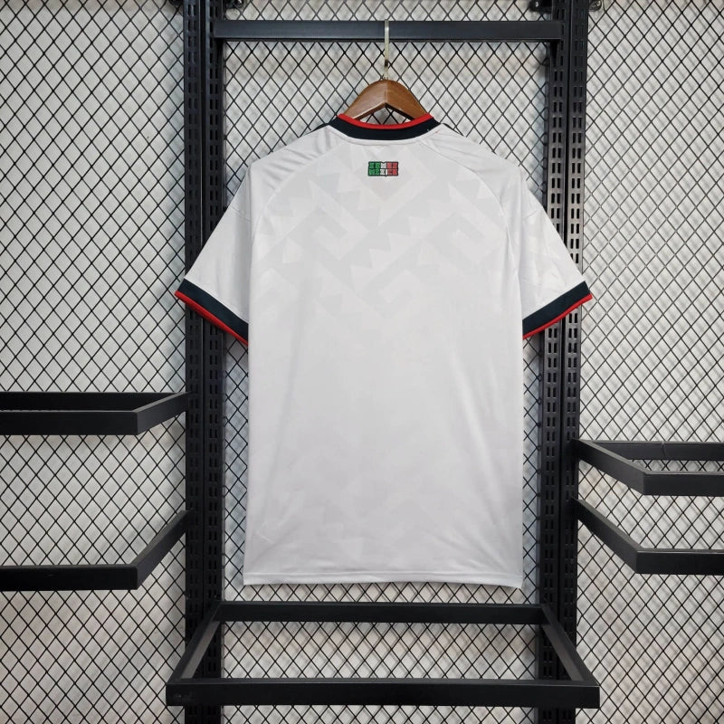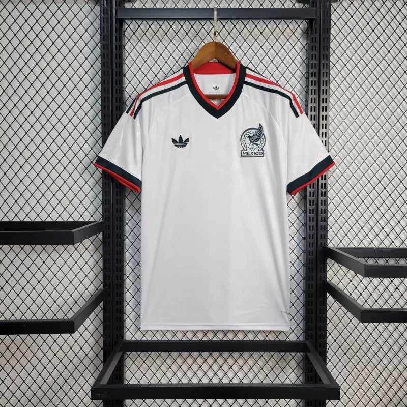 Meksikon maajoukkueen virallinen vieraspaita kaudelle 2026. Valkoinen, tummilla yksityiskohdilla, klassisen retrotyylin innoittama.
