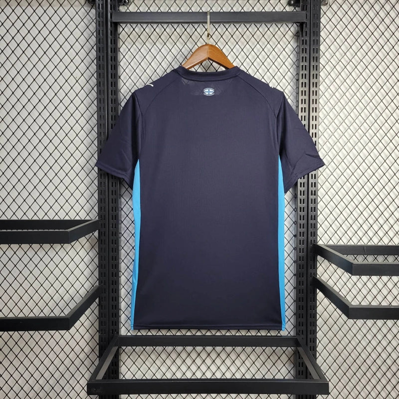 Olympique Marseillen vieraspaita kaudelle 2025. Tummansininen, sinisillä yksityiskohdilla ja hienovaraisella kuviolla edessä. Tyylikkyyden ja urheilullisen eleganssin yhdistelmä.