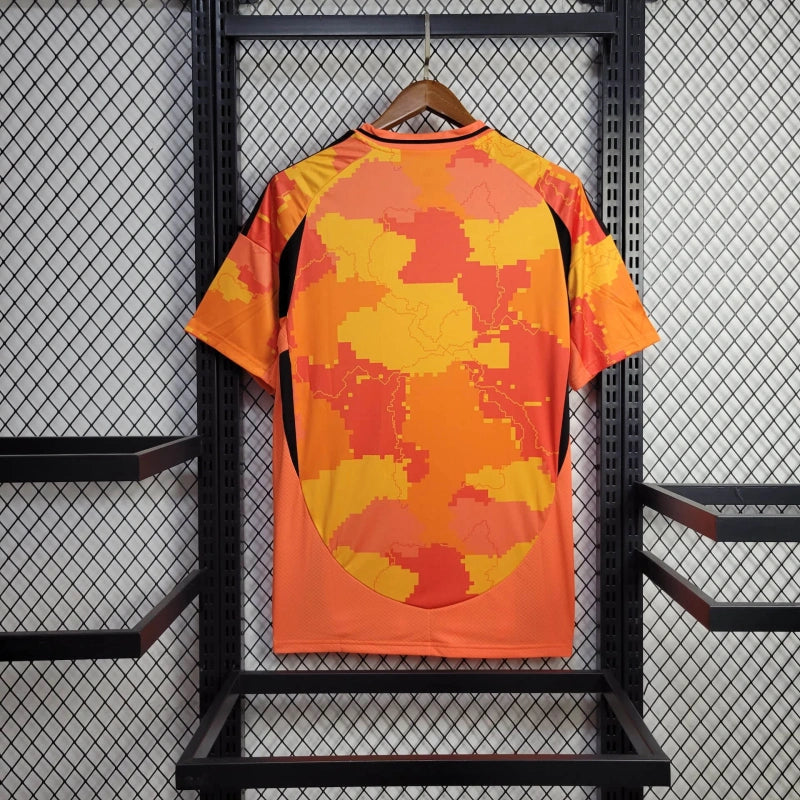 Paris FC:n vieraspaita kaudelle 2025. Rohkea oranssi ja keltainen camouflage-kuvio mustilla yksityiskohdilla. Energinen design, joka erottuu kentällä.