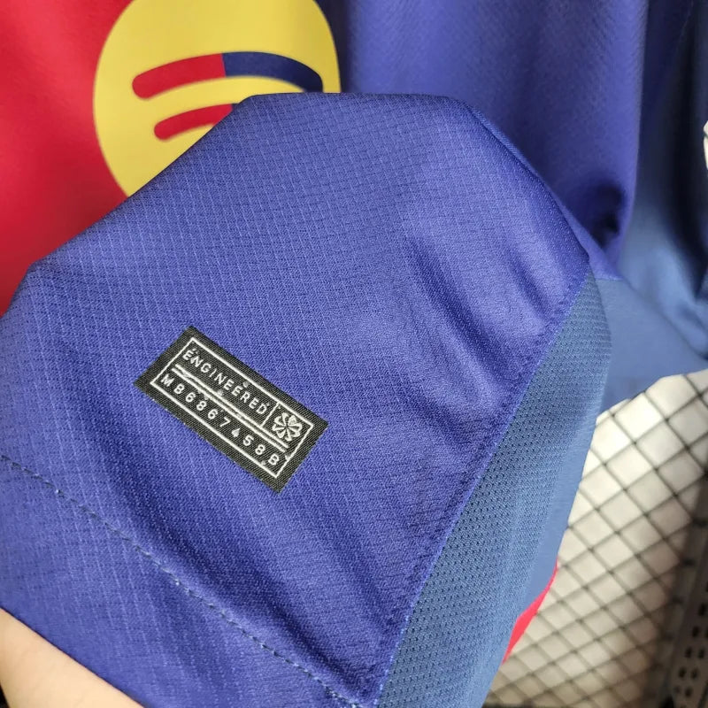 Domowa koszulka FC Barcelony na sezon 2024 to klasyczny projekt Nike, który powraca do pionowego podziału na granatową i bordową połowę. Złote logo oraz herb klubu w centralnej części symbolizują prestiż i tradycję „Blaugrany”. Sponsor Spotify dodaje nowoczesnego akcentu, tworząc połączenie historii i współczesności.