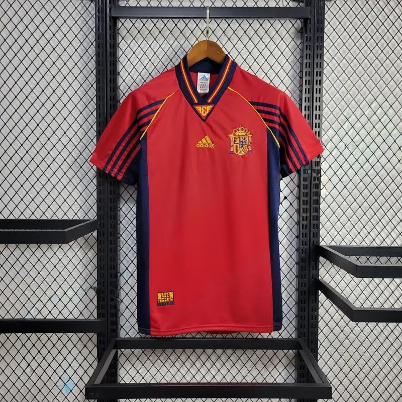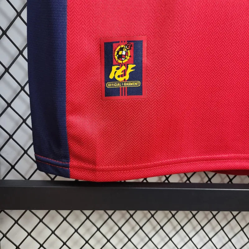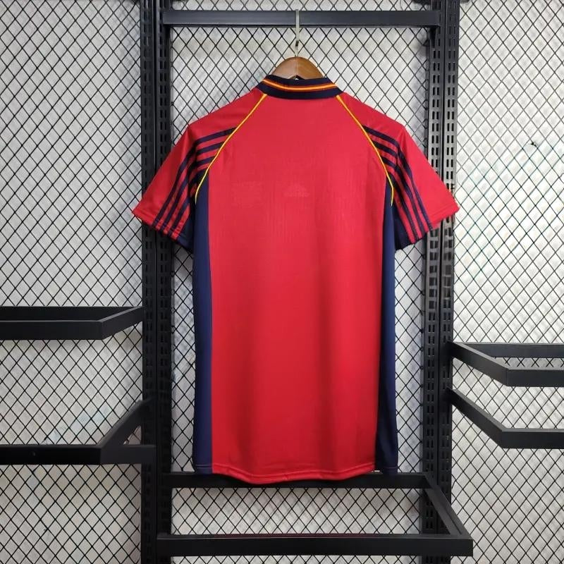 Historyczna domowa koszulka reprezentacji Hiszpanii z 1998 roku. Intensywna czerwień połączona z granatowymi i żółtymi akcentami tworzy wyjątkowy retro styl. Idealna dla fanów klasycznych koszulek i wszystkich, którzy kochają klimat lat 90.