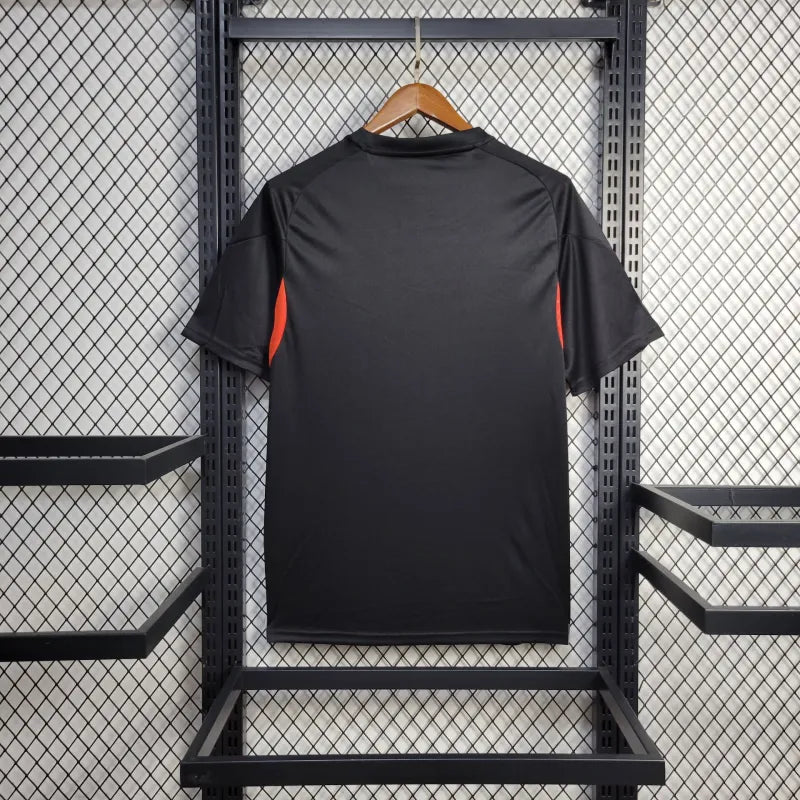 Czarna koszulka treningowa Benfiki na sezon 2025. Prosty, elegancki design z czerwonymi akcentami po bokach i białymi paskami na ramionach. Idealna na treningi lub codzienne noszenie.