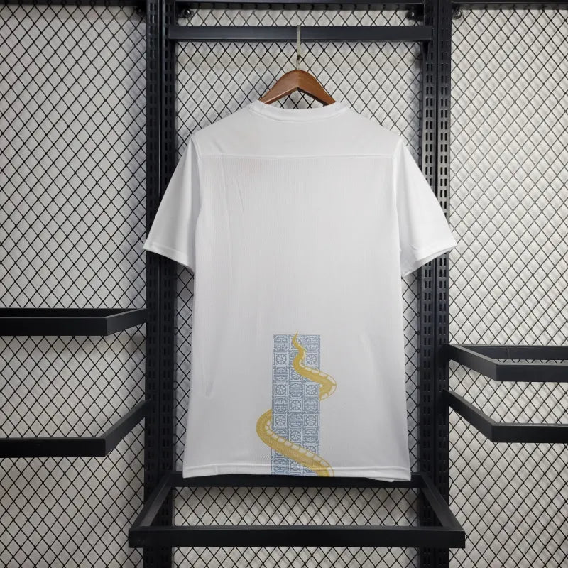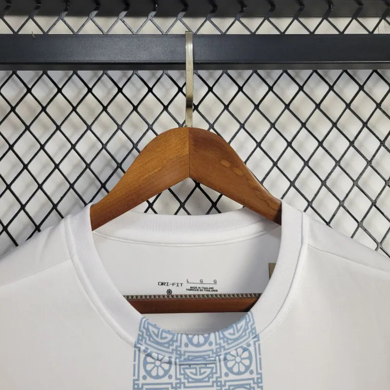 Nowoczesna, elegancka i symboliczna – biała koszulka z niebiesko-złotym wzorem pośrodku prezentuje się wyjątkowo. Idealna dla kibiców Spurs, którzy cenią elegancję i oryginalność.