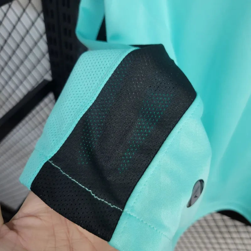Nowoczesna koszulka trzecia Sportingu Lizbona na sezon 2025. Miętowy kolor z czarnymi detalami i minimalistycznym wzorem. Lekka, stylowa i idealna dla fanów „Leões”.