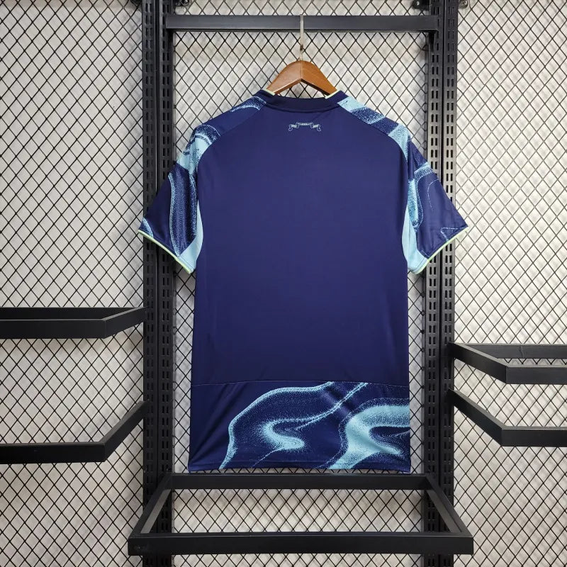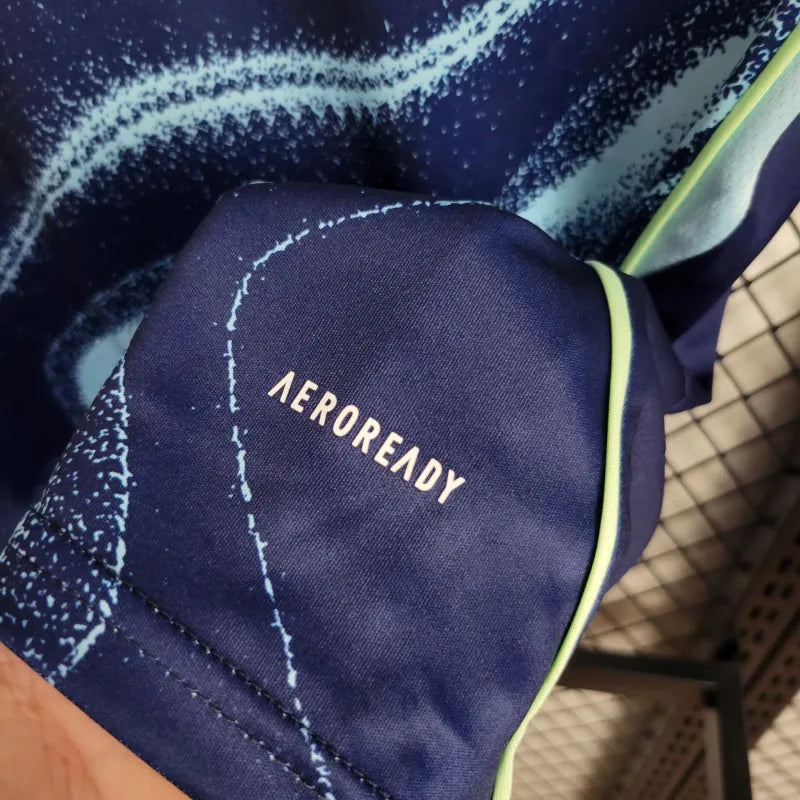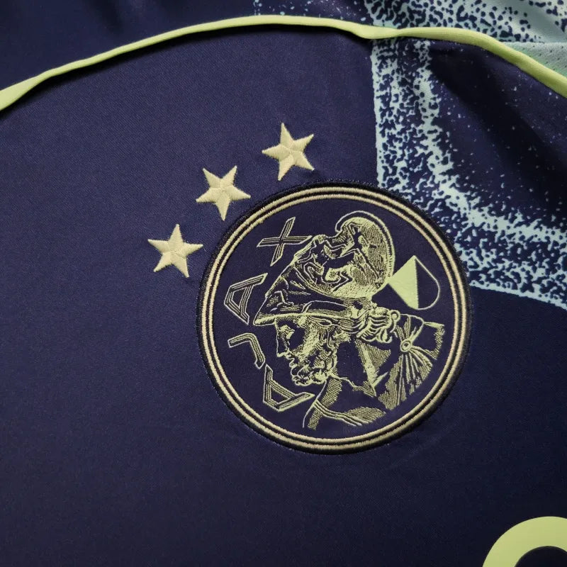 Oficjalna koszulka wyjazdowa Ajaxu Amsterdam na sezon 2025. Granatowy model z turkusowymi, falującymi wzorami i logo sponsora Ziggo. Nowoczesny design inspirowany energią miasta i stylem gry zespołu.