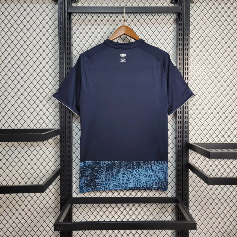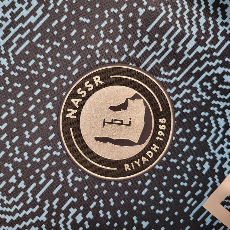 Koszulka wyjazdowa Al Nassr na sezon 2025. W ciemnoniebieskiej tonacji z jasnoniebieskim wzorem przypominającym cyfrową teksturę. Stylowa i technologicznie zaawansowana, stworzona z lekkiego materiału zapewniającego przewiewność i swobodę ruchów.