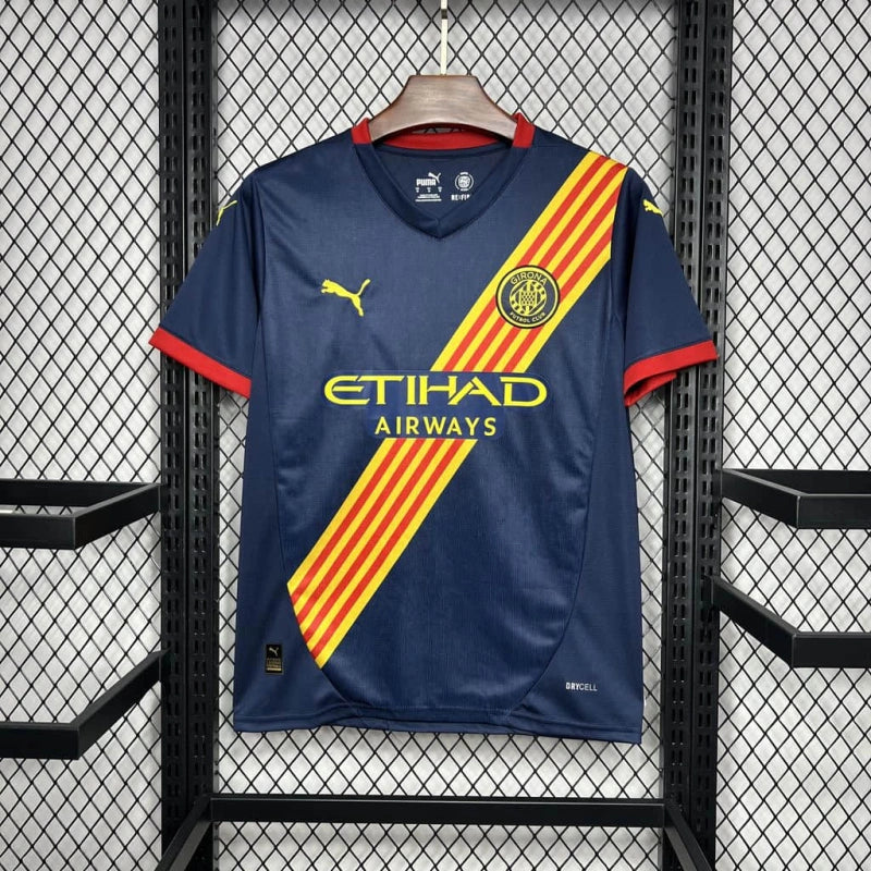 Koszulka wyjazdowa Girona 2024 łączy tradycję z nowoczesnością. Granatowy kolor uzupełniony żółto-czerwonymi pasami nawiązuje do barw Katalonii, tworząc unikatowy wygląd pełen charakteru. Idealna dla kibiców, którzy cenią lokalną dumę.