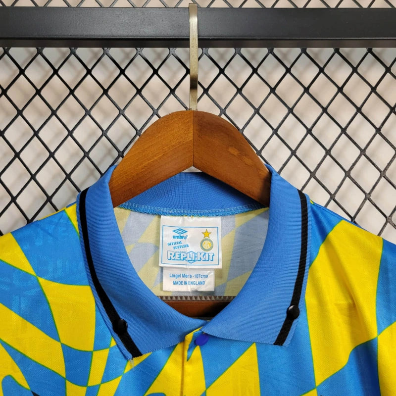 Unikalna koszulka wyjazdowa Interu z 1992 roku. Żółto-niebieski wzór z charakterystycznym geometrycznym motywem i logo Fiorucci. Prawdziwa perełka dla kolekcjonerów retro.