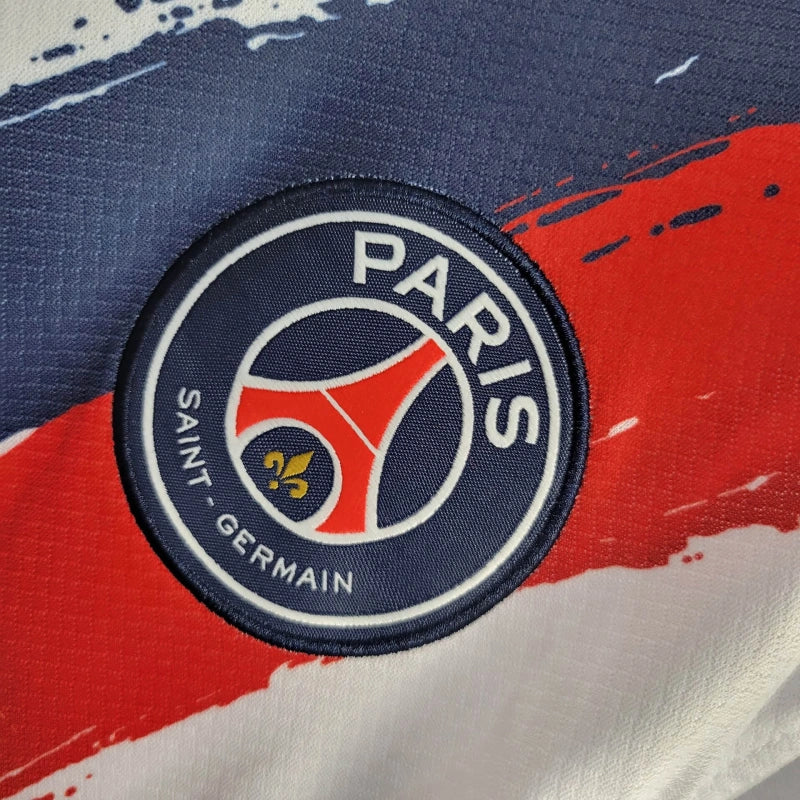 Koszulka wyjazdowa PSG na sezon 2024 to artystyczne połączenie bieli z dynamicznymi pociągnięciami pędzla w granatowym i czerwonym kolorze – symbolach paryskiego klubu. Projekt Nike łączy elegancję i nowoczesność, a logo Qatar Airways na środku podkreśla prestiż drużyny z Parc des Princes.