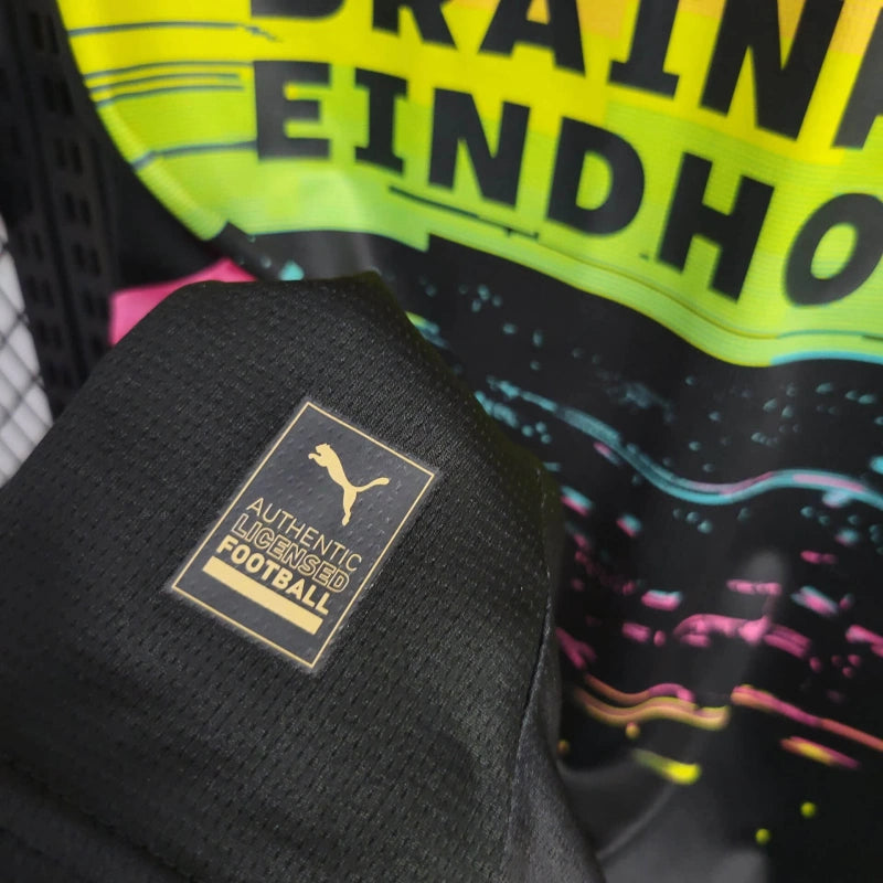 Nowoczesna koszulka wyjazdowa PSV Eindhoven na sezon 2024 przyciąga wzrok futurystycznym wzorem w neonowych barwach. Czarna baza połączona z kolorowym, cyfrowym motywem symbolizuje energię i innowacyjność miasta Eindhoven – centrum technologii i designu. Projekt od Pumy łączy styl i funkcjonalność, gwarantując maksymalny komfort.
