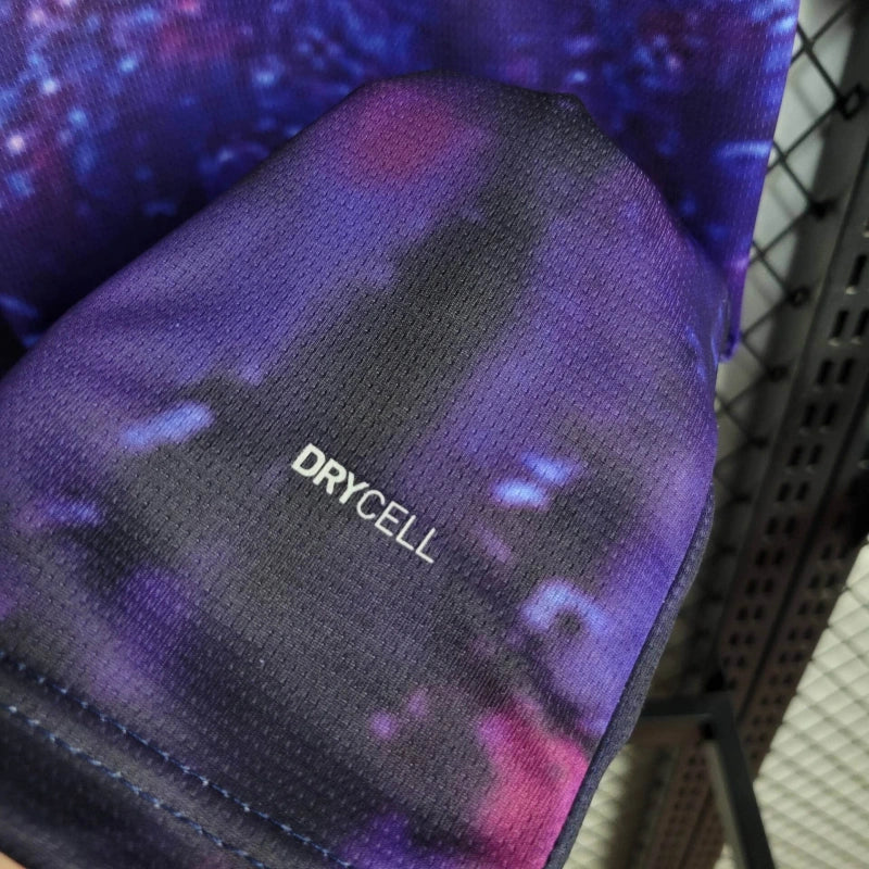 Camiseta artística do Manchester City 2025 com um padrão cósmico único. A combinação de roxo e azul cria um efeito profundo e dinâmico. O logotipo da Etihad Airways e o escudo do clube em rosa intenso enfatizam o design moderno. Perfeito para uso diário e durante o treino.