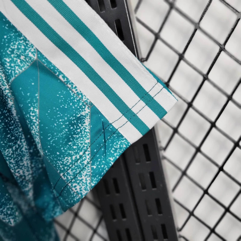 A icônica camisa da seleção alemã de 1990 da Adidas em turquesa com padrão geométrico de estilo retrô. Este modelo é um símbolo da era de ouro do futebol alemão, que terminou com o triunfo na Copa do Mundo da Itália.